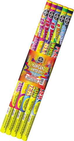 Assorted Roman Candles with 4 assorted effects including Whistling Dragon Roman Candle 8 shots, Blue Thunder Roman Candle 8 shots, Sky Thunder Roman Candle 8 shots, and Magic Sky Roman Candle 8 shots