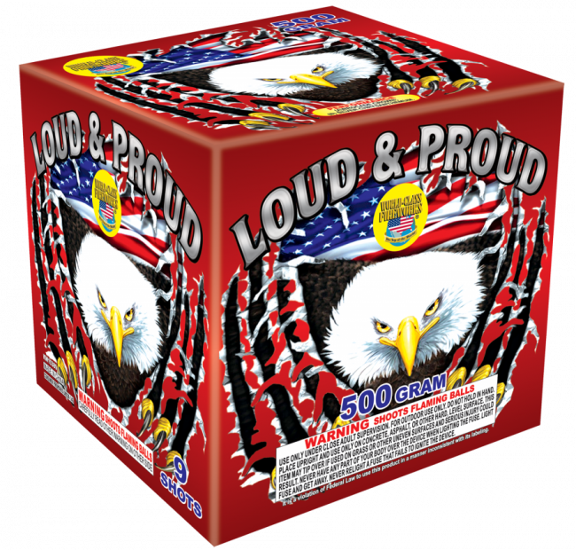Make some noise as you celebrate with Loud and Proud! With 500 grams of power, this giant has enough “oomph” to make as big of a boom as you need! Nine shots of brocade crowns and silver chrysanthemums drift and crackle in the sky, awing any audience. You need this!